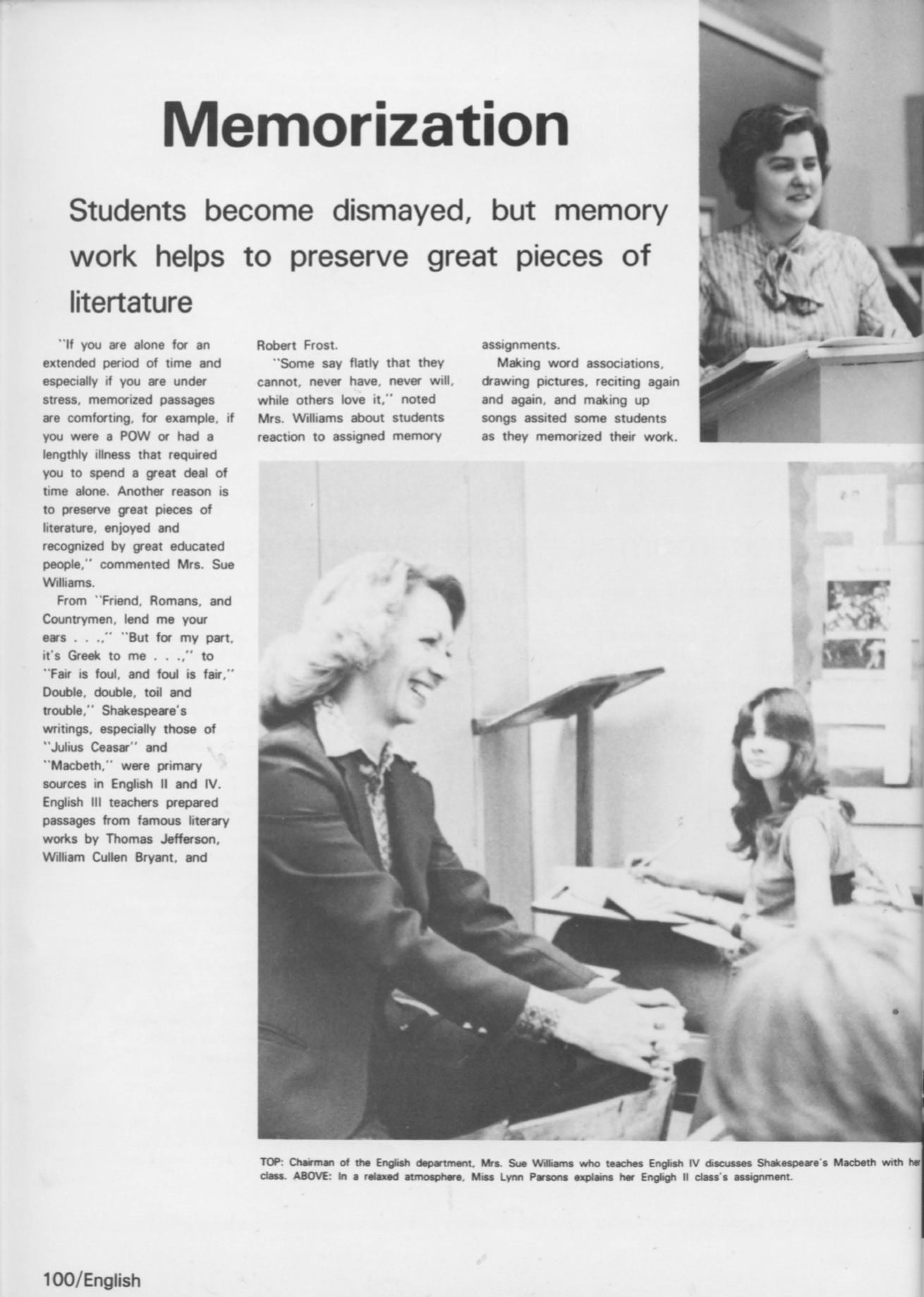 TOP: Chairman of the English department, Mrs. Sue Williams who teaches English IV discusses Shakespeare's Macbeth with